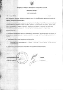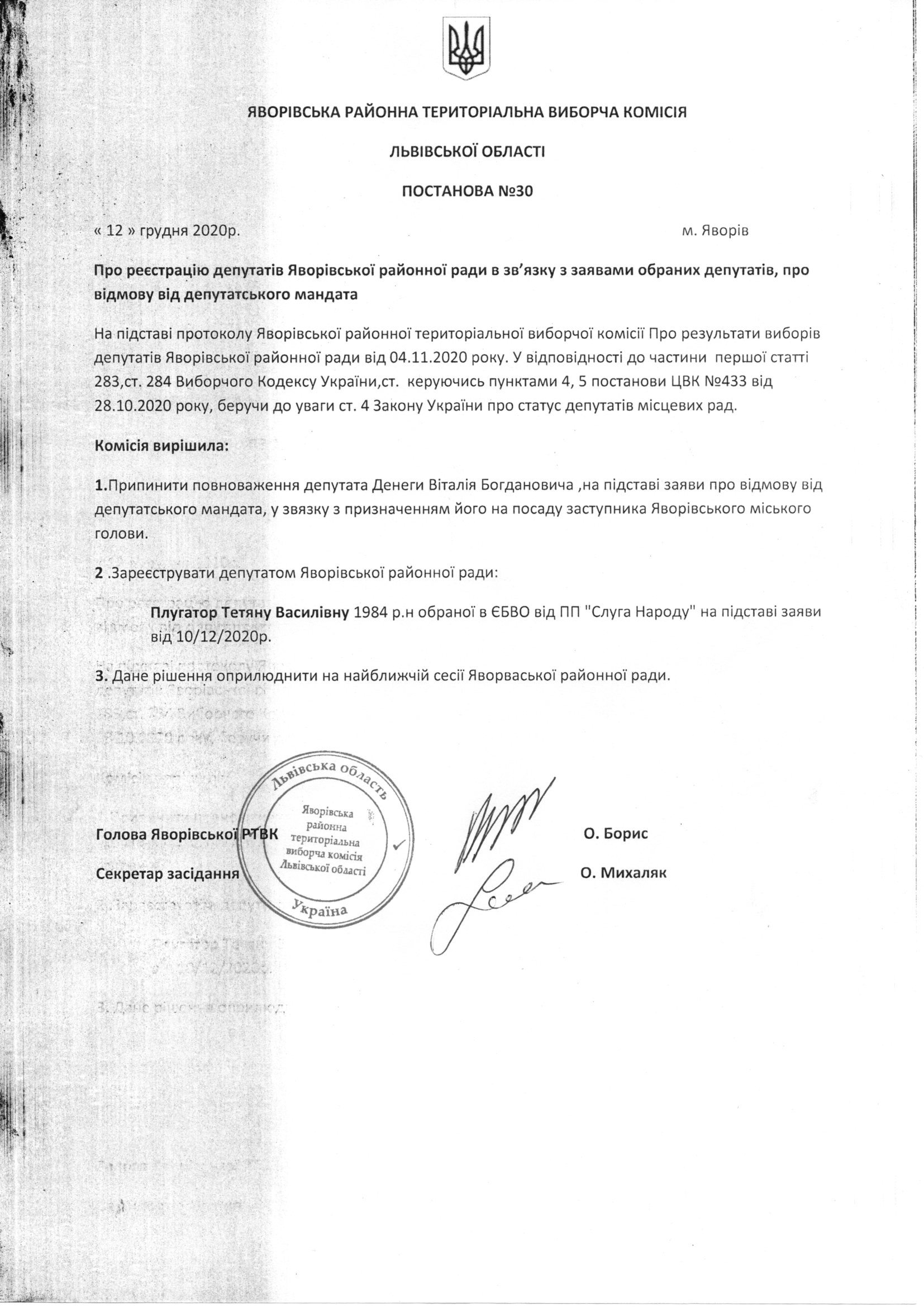 - Постанова № 30 про реєстрацію депутатів Яворівської районної ради в зв'язку з заявами обраних депутатів, про відмову від депутатського мандата