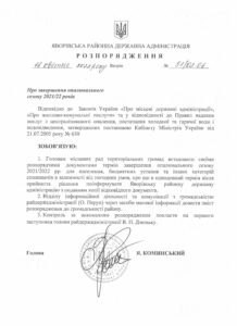 Відповідне розпорядження Про завершення опалювального сезону 2021/2022 років №51/02-06 від 18 квітня 2022 року підписав голова Яворівської райдержадміністрації Ярослав Коминський