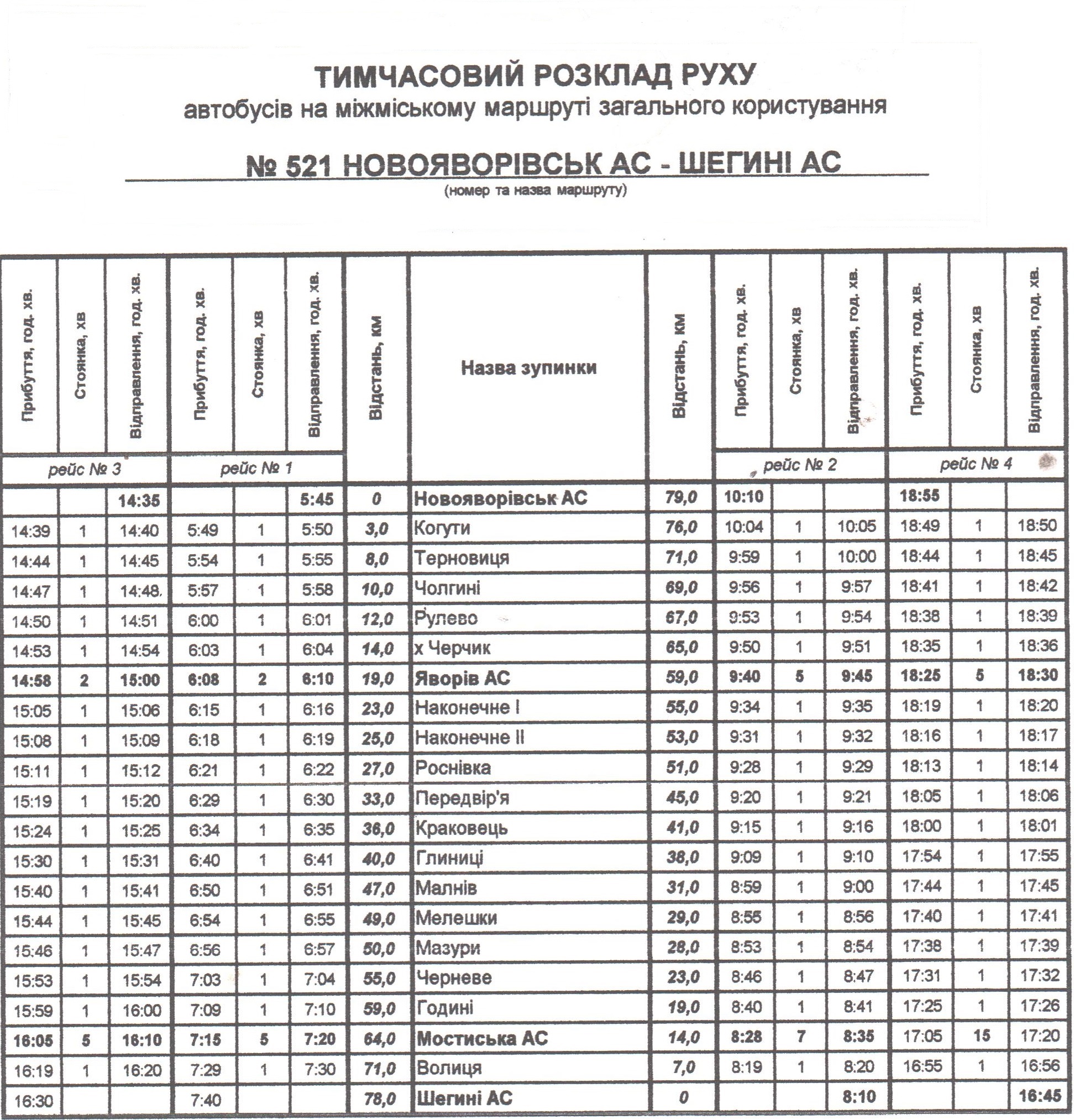 За сприянням Управлінням транспорту та зв’язку Львівської обласної державної адміністрації, Яворівської районної державної адміністрації, Яворівської районної ради  14 вересня 2021 року відновлюється курсування транспортних засобів на міжміському автобусному маршруті № 521 Новояворівськ АС – Шегині АС  за наступним розкладом руху автотранспорту.